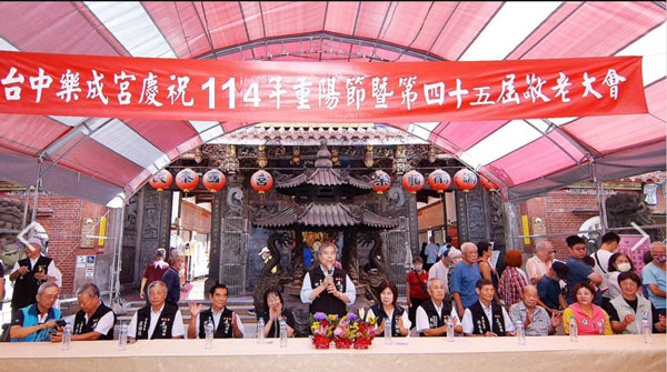 台中樂成宮秉持「老吾老以及人之老」宏揚敬老文化,感恩長者過去對家庭、社會、國家的貢獻,功不可滅,沒有他們過去的努力,就沒有後代子孫的豐衣足食,敬老實質是對老人過去辛勞的一種精神回報,更以媽祖慈悲、關懷及崇敬的態度來舉辦重陽敬老大會已屆滿44年。