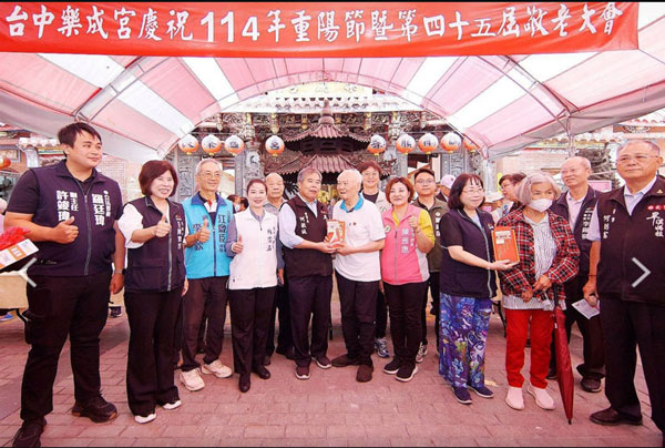 台中樂成宮秉持「老吾老以及人之老」宏揚敬老文化,感恩長者過去對家庭、社會、國家的貢獻,功不可滅,沒有他們過去的努力,就沒有後代子孫的豐衣足食,敬老實質是對老人過去辛勞的一種精神回報,更以媽祖慈悲、關懷及崇敬的態度來舉辦重陽敬老大會已屆滿44年。