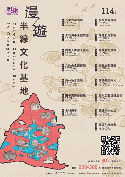 無論您是尋找老街的職人故事、八堡圳的水源文化、王功的潮間生態,亦是田中窯陶藝手作,都能透過此次活動深度體驗彰化豐饒的文化底蘊。每場次名額30人,額滿為止,報名網址:https://reurl.cc/9bElvn。