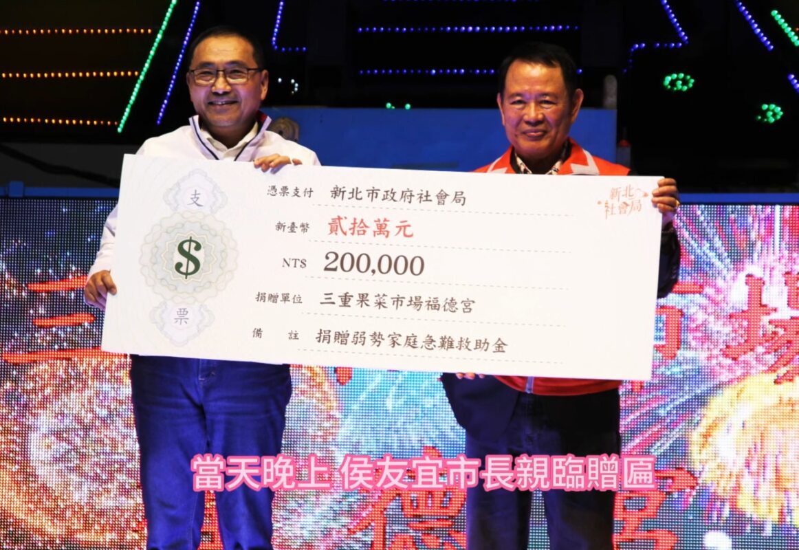 【記者陳見明/新北三重採訪報導】 115 年 3月 15日星期日,三重果菜市場福德宮建宮 30 週年慶,響應好日子愛心大平台,捐贈新北市政府社會局弱勢家庭急難救助金新臺幣 20 萬元 ,當天晚上,侯友宜市長親臨贈匾,感謝福德宮三十載守護市場,千萬心點亮公益共傳大愛,座落於三重果菜批發市場,守護市場 30 年的「三重果菜市場福德宫」.